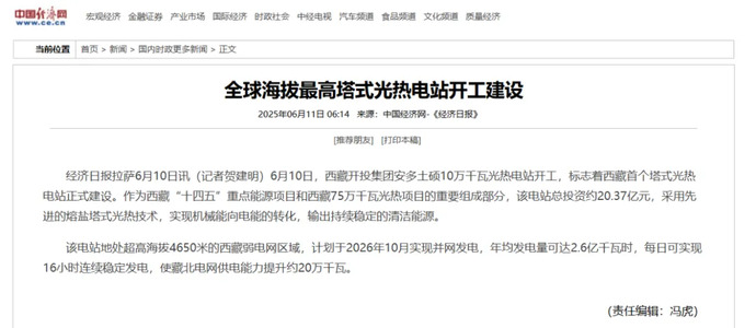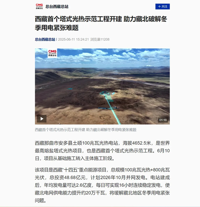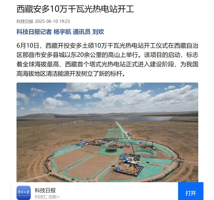 媒體報(bào)道丨全球海拔最高、西藏首個(gè)塔式光熱電站開工建設(shè)