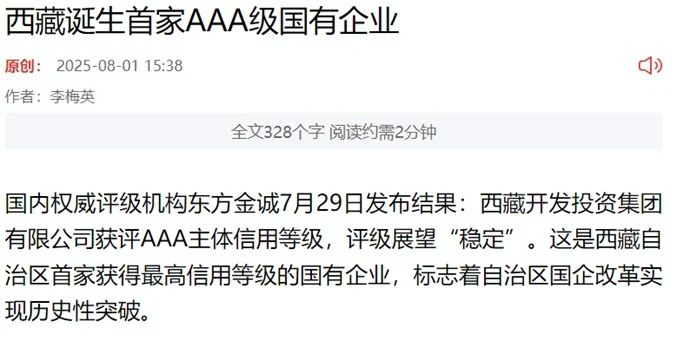 媒體報(bào)道丨西藏誕生首家AAA級國有企業(yè)