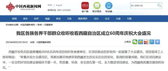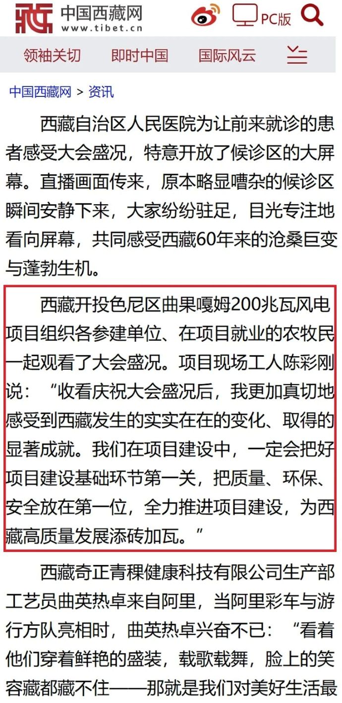 ?。冈?2日,西藏開投色尼區(qū)曲果嘎姆200兆瓦風(fēng)電項(xiàng)目組織各參建單位干部職工、在項(xiàng)目就業(yè)的農(nóng)牧民一起觀看西藏自治區(qū)成立60周年慶祝大會盛況的消息,被中國西藏網(wǎng)、西藏日報、中國西藏新聞網(wǎng)、西藏法制報等各級媒體平臺宣傳報道。