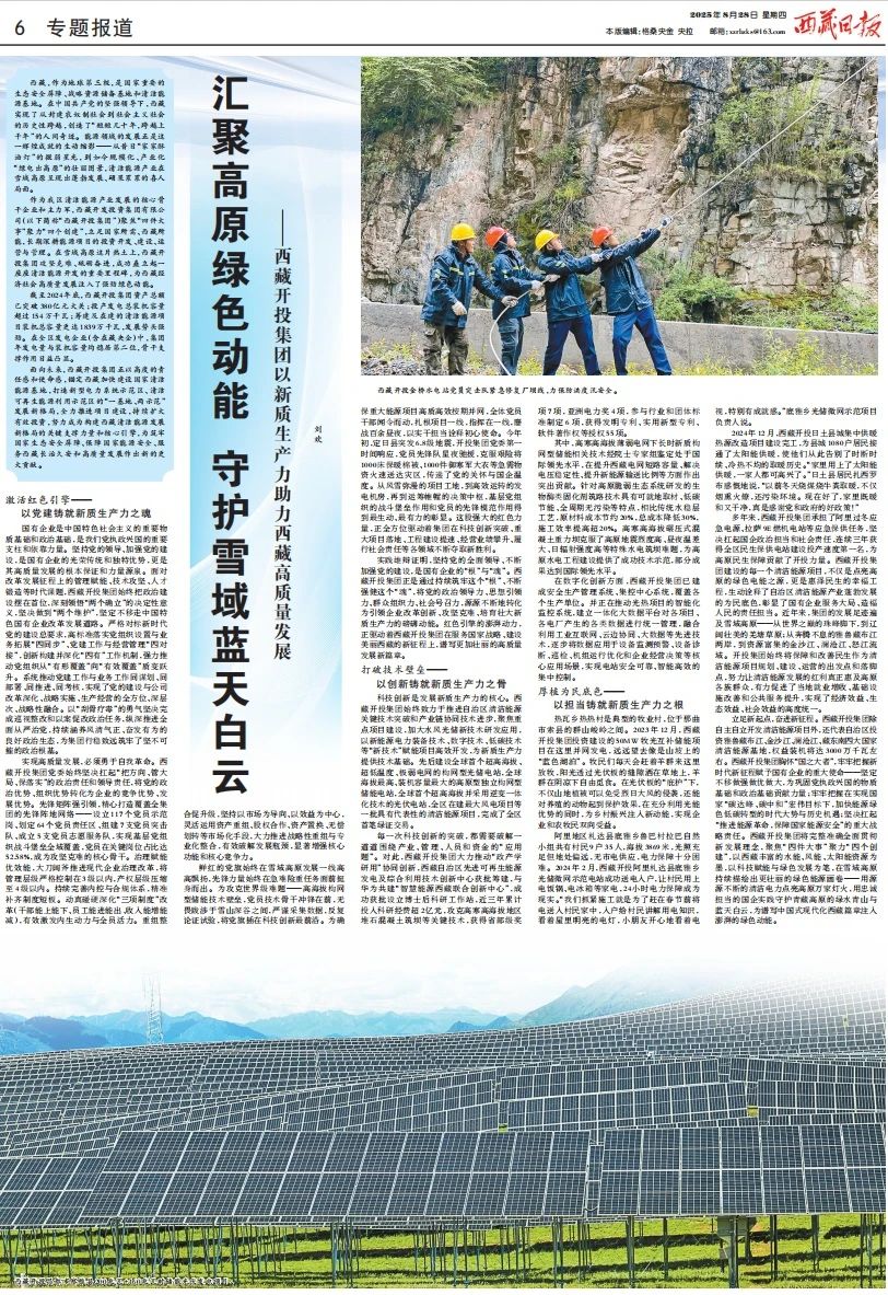 8月28日,《西藏日報(bào)》以題為《匯聚高原綠色動能 守護(hù)雪域藍(lán)天白云——西藏開投集團(tuán)以新質(zhì)生產(chǎn)力助力西藏高質(zhì)量發(fā)展》的整版文章,專題報(bào)道了西藏開投集團(tuán)近年來致力國企改革、發(fā)展新質(zhì)生產(chǎn)力,推動西藏清潔能源產(chǎn)業(yè)高質(zhì)量發(fā)展的階段性成績。一起來看詳細(xì)報(bào)道↓↓↓。
