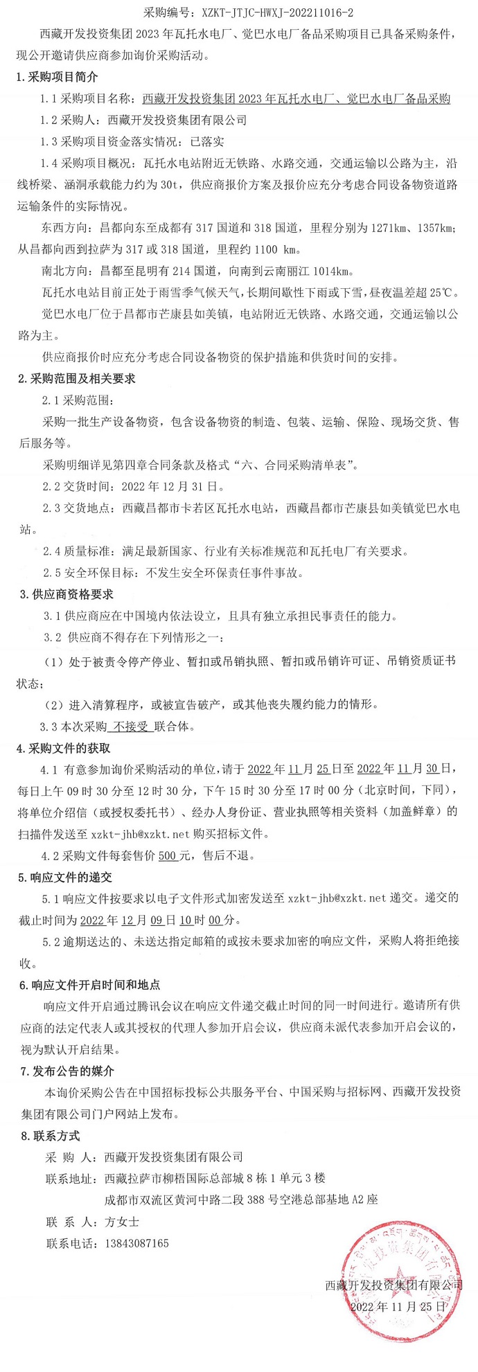西藏開(kāi)發(fā)投資集團(tuán)2023年瓦托水電廠、覺(jué)巴水電廠備品